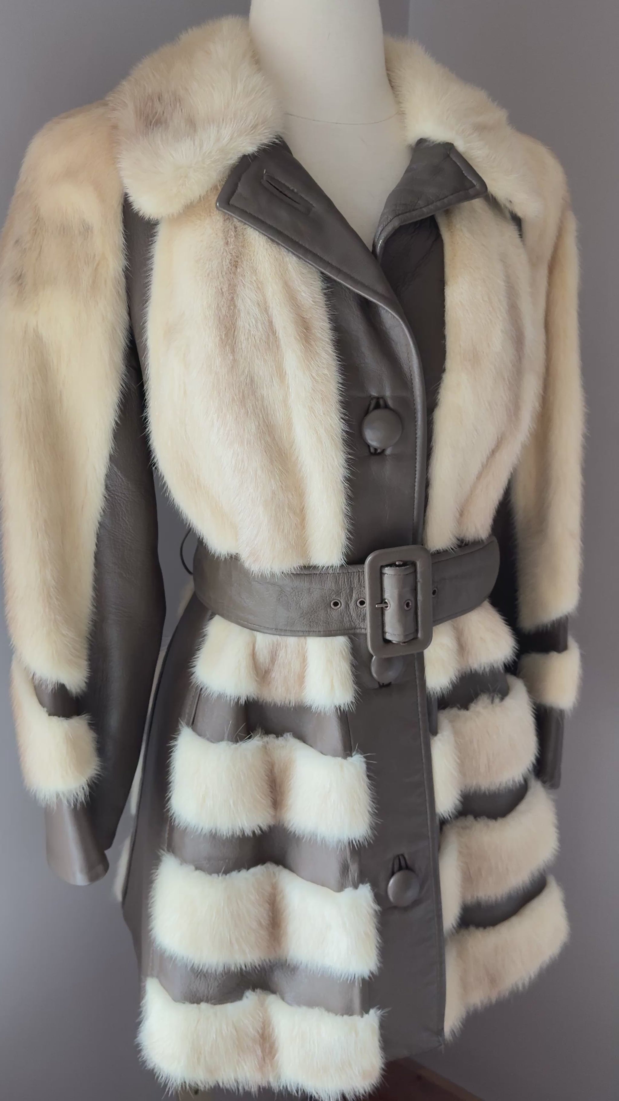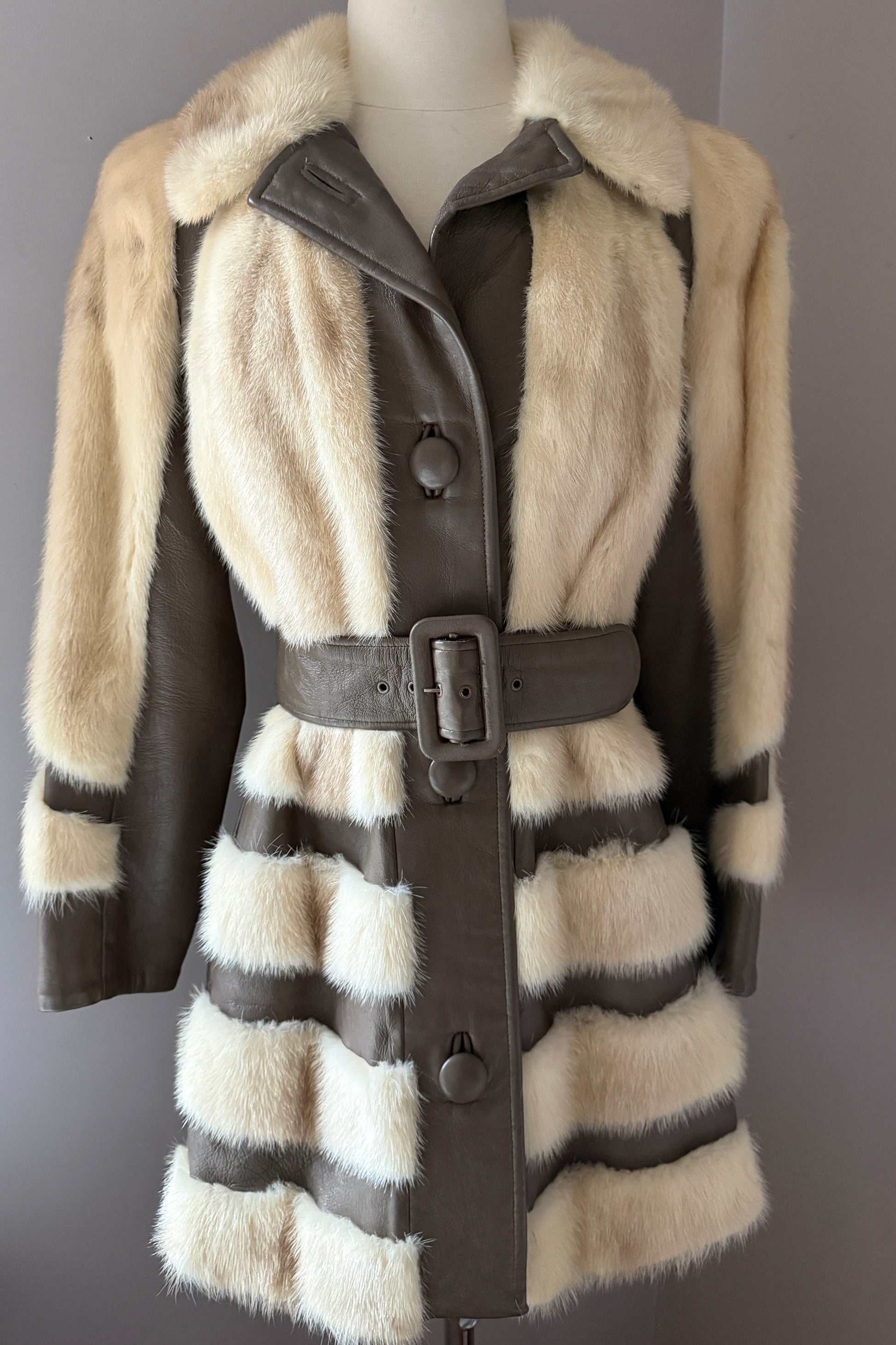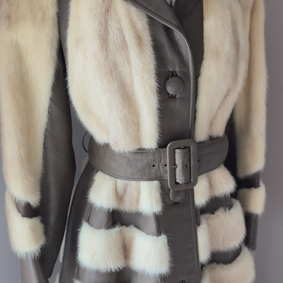 Immaculate vintage mink and leather coat from the 1970s, crafted in Los Angeles. A true statement piece — soft cream mink panels paired with supple taupe leather, finished with a matching belt and oversized covered buttons. Fully lined and beautifully constructed with incredible attention to detail.