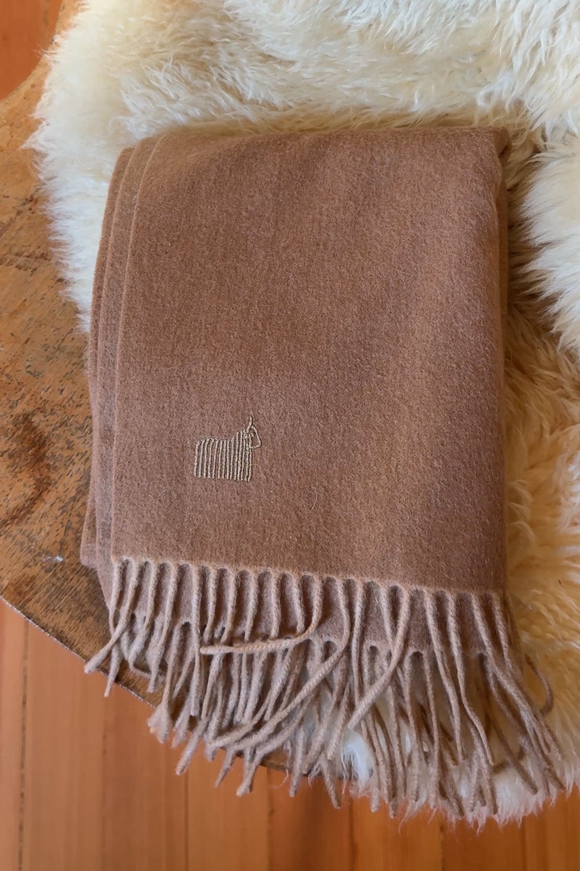 Colombo 100% cashmere scarf in warm tan. Made in Italy. Soft, classic, and effortlessly elegant.