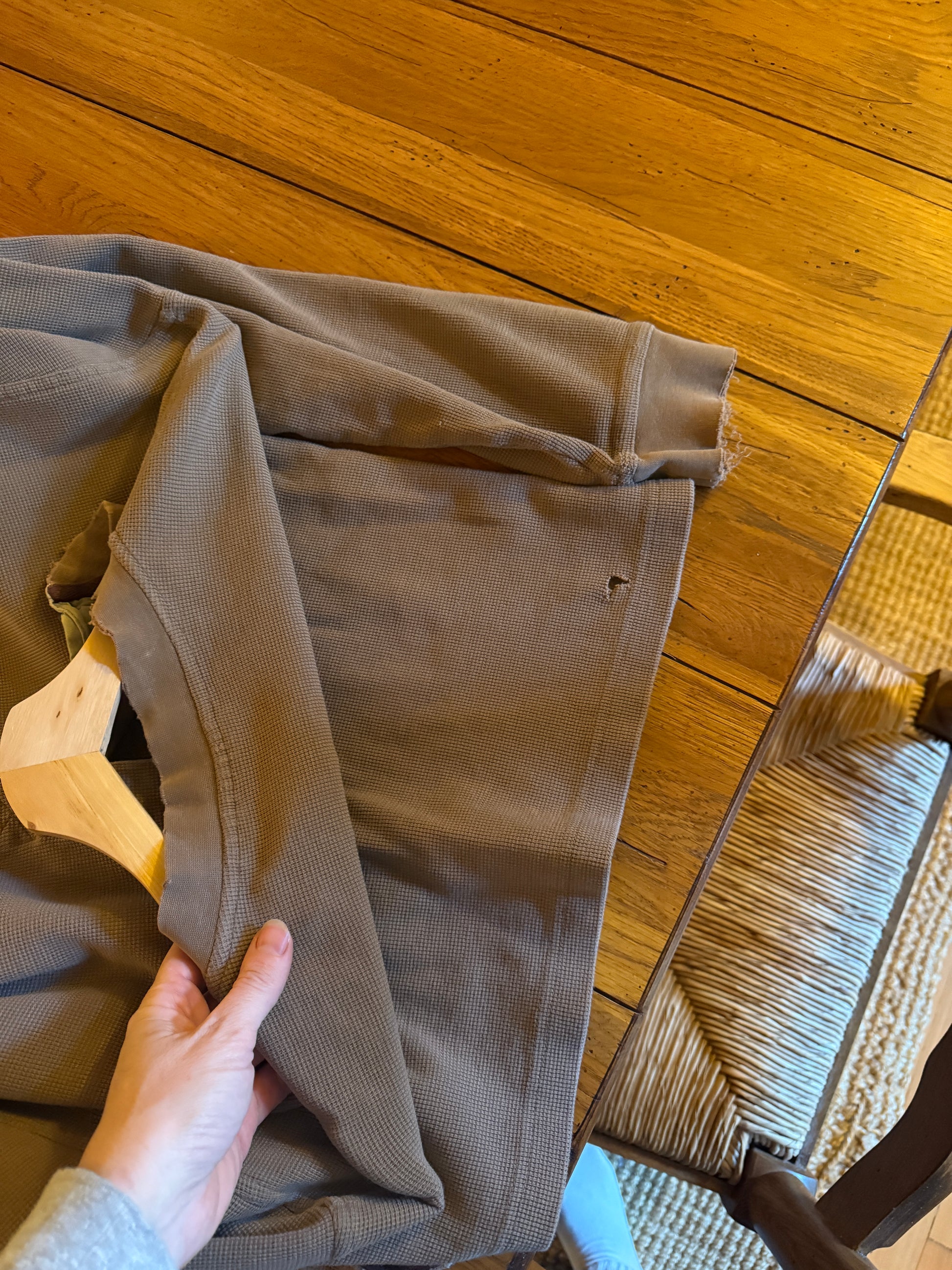 A soft cotton waffle henley with an easy, relaxed fit and worn-in feel. Flawed with a small hole at the back, reflected in price — still a comfortable everyday layer with plenty of life left.