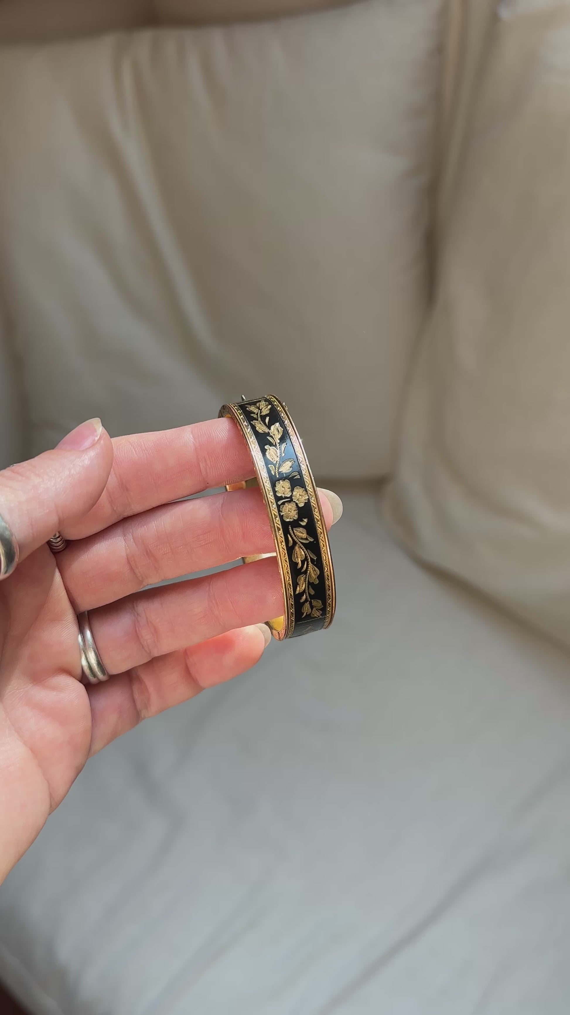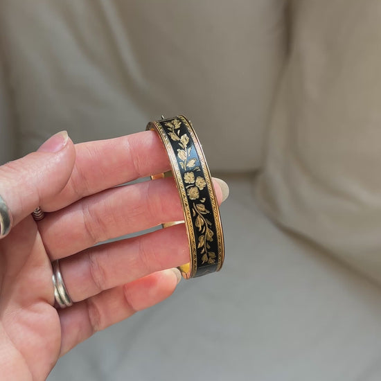Stunning vintage FMCO 10k gold-filled bracelet featuring intricate floral engraving and rich black enamel detailing.