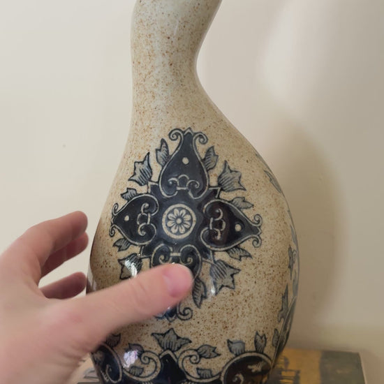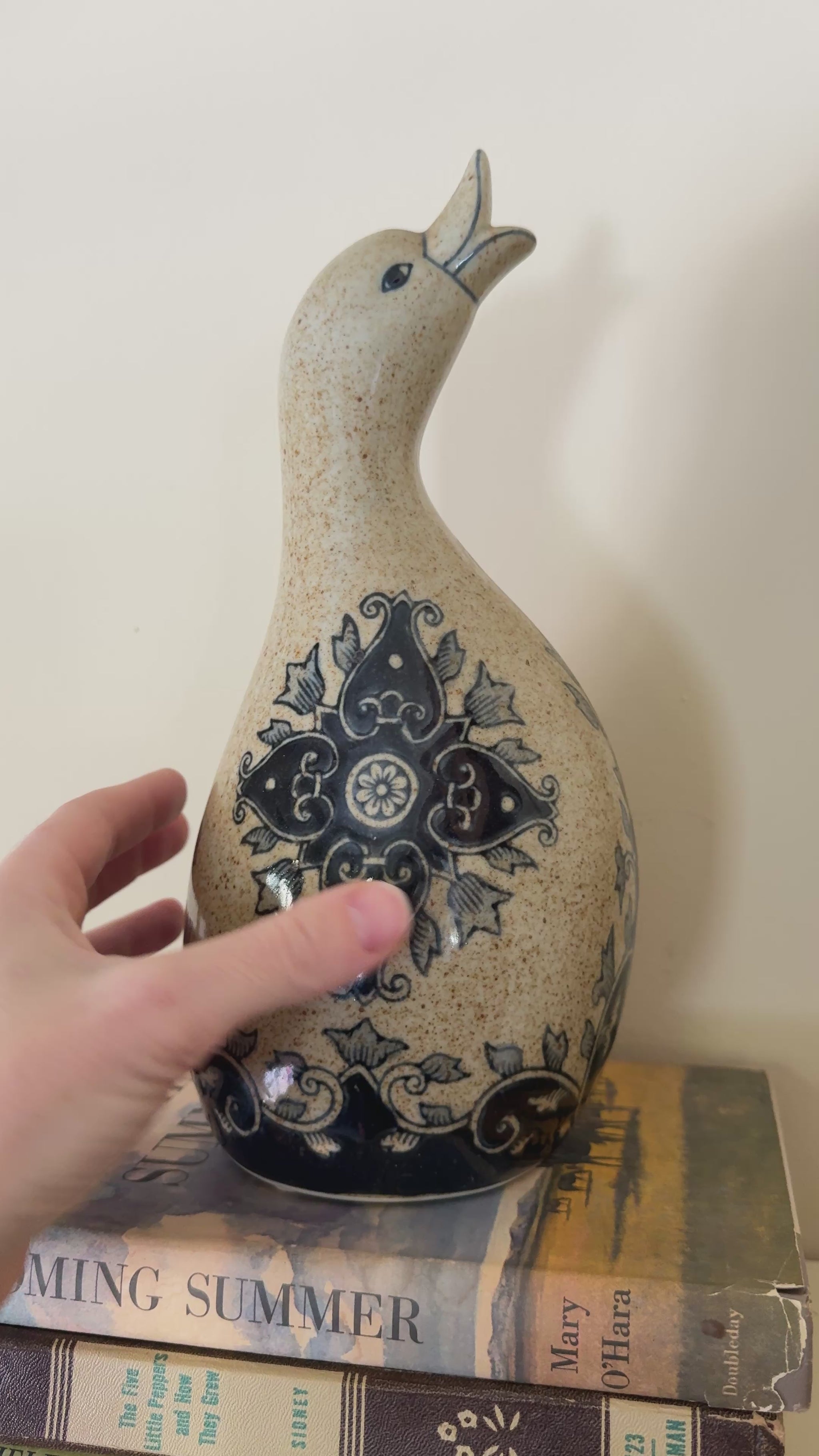 A sculptural ceramic duck figure finished in a speckled cream glaze with black floral detailing. Whimsical without feeling kitschy, this piece adds personality to shelves, book stacks, or collected vignettes.