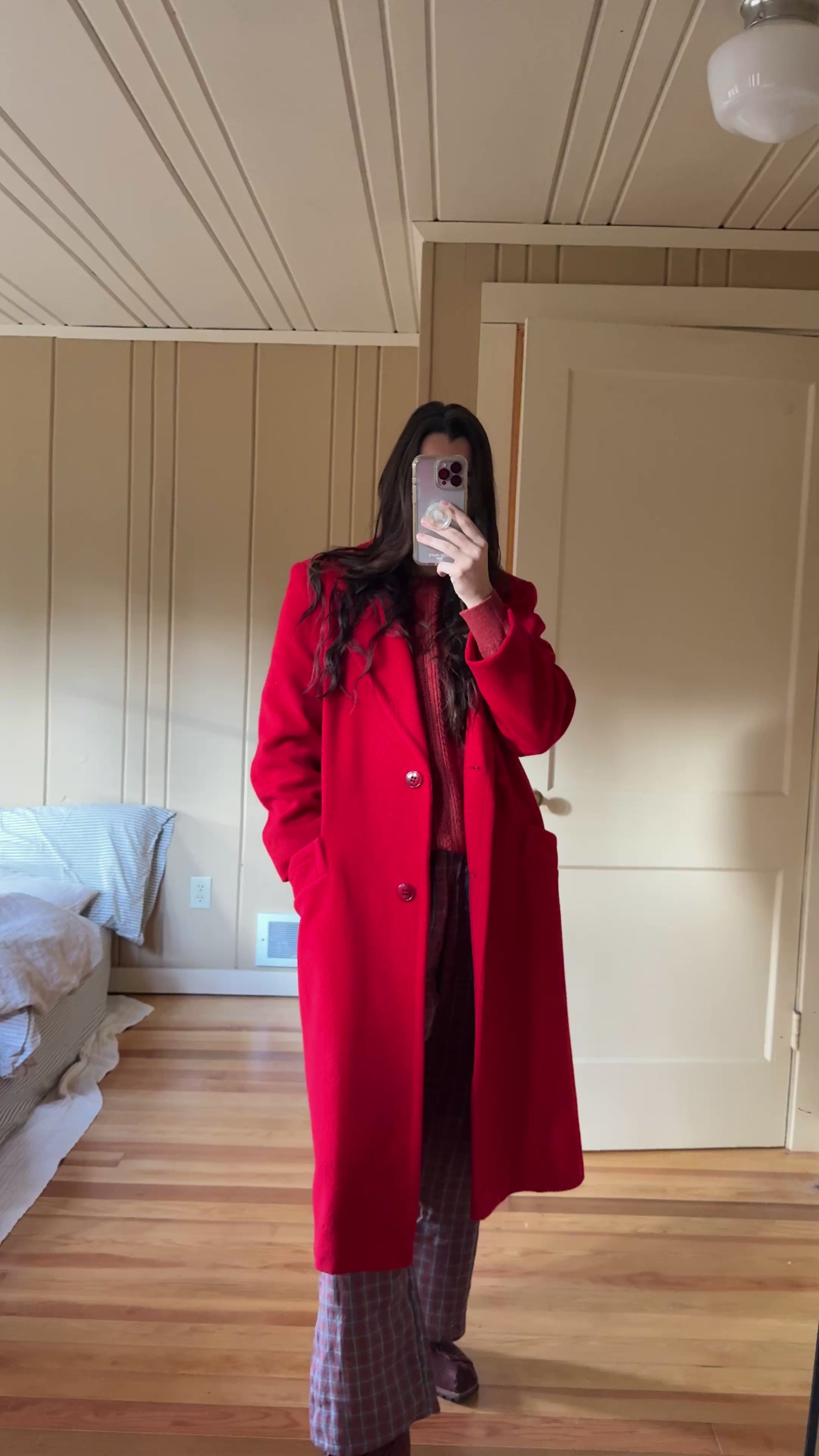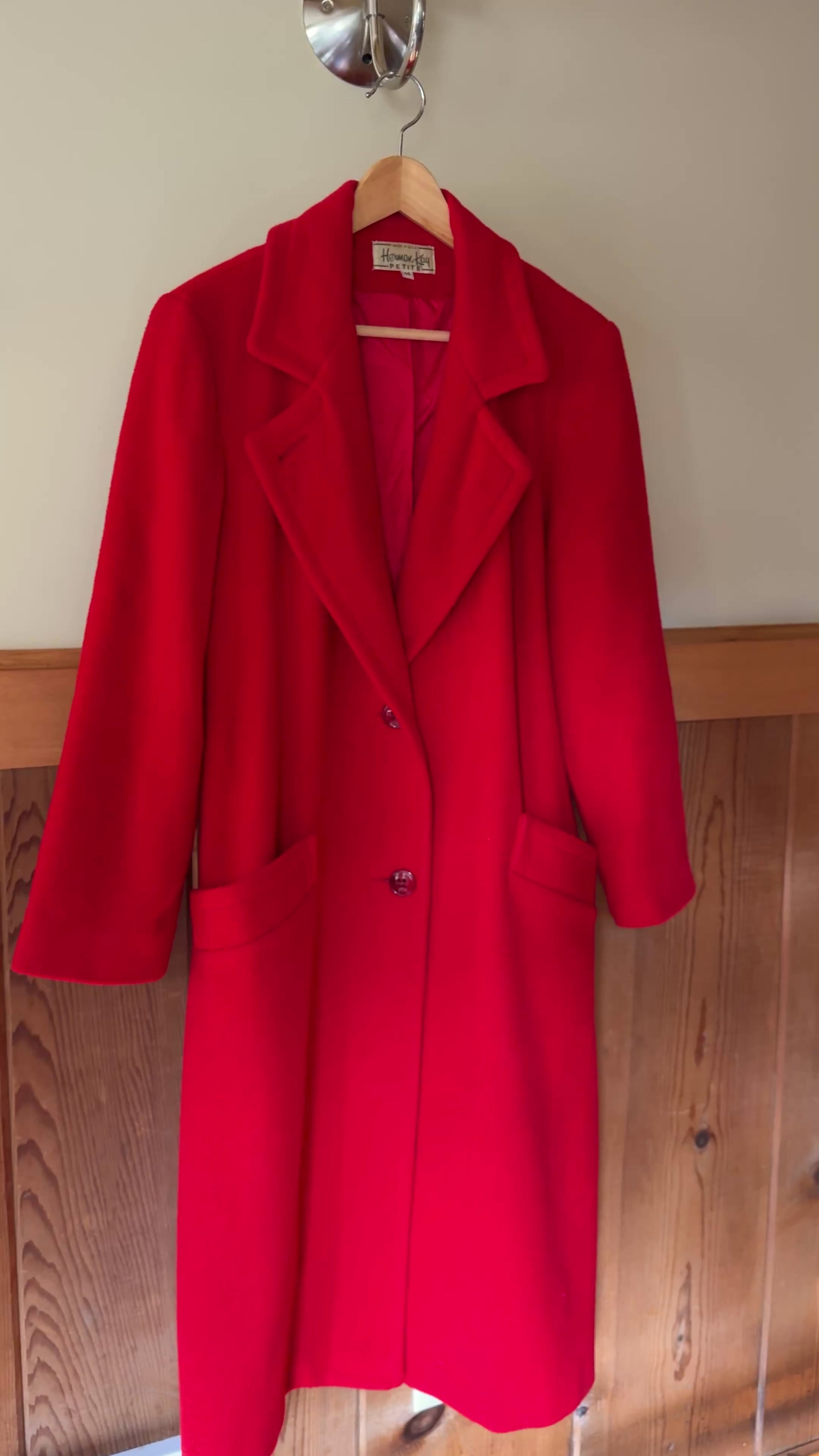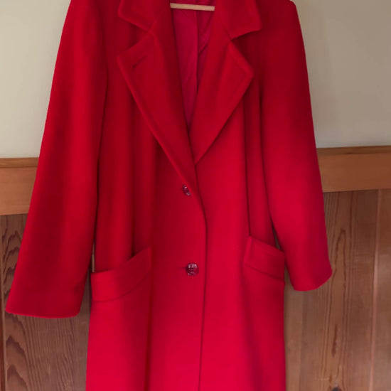 A gorgeous Herman Kaye wool coat in a rich holiday red. The coat has minor vintage wear from moths near the hem—small areas of subtle texture that are hard to notice when worn.