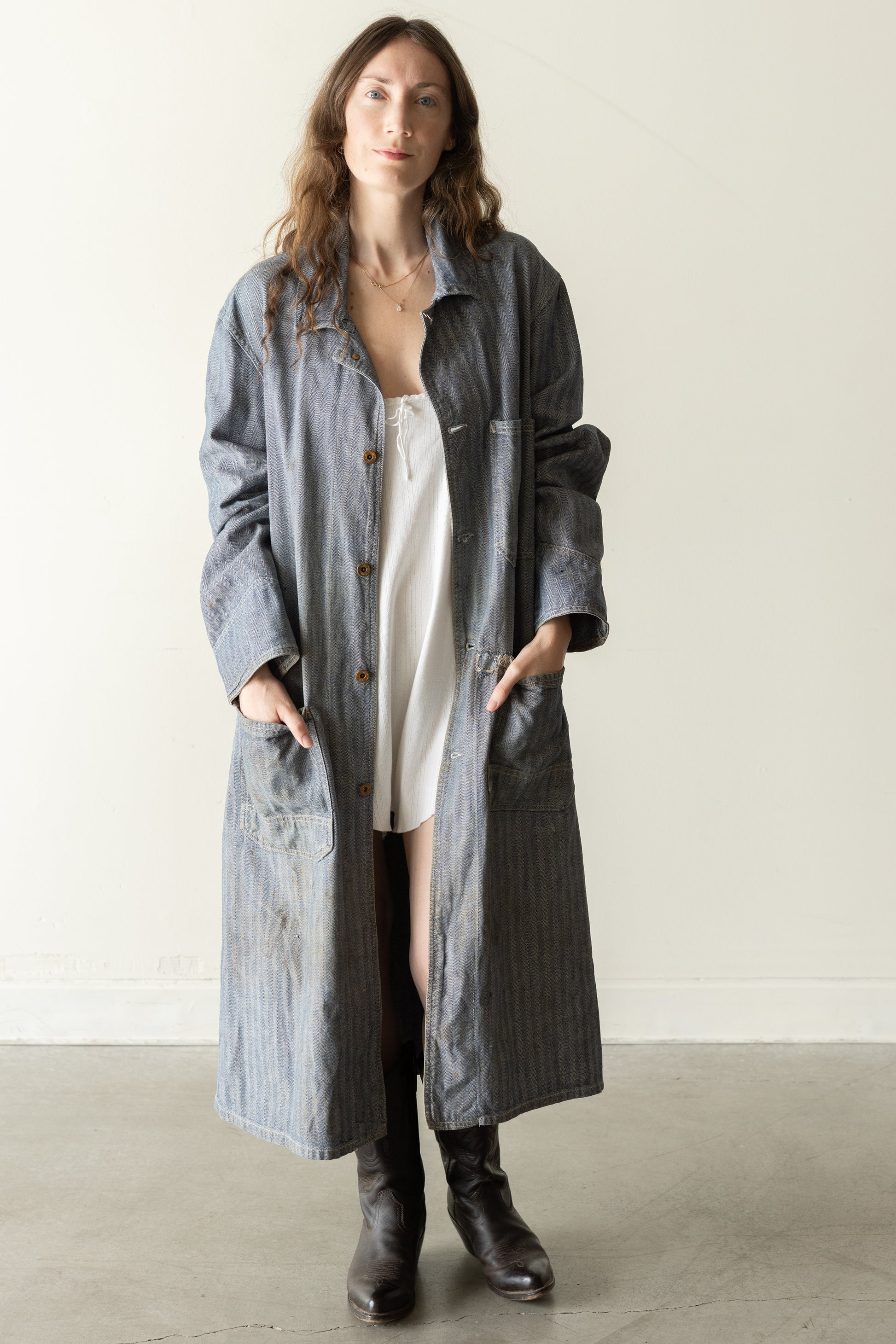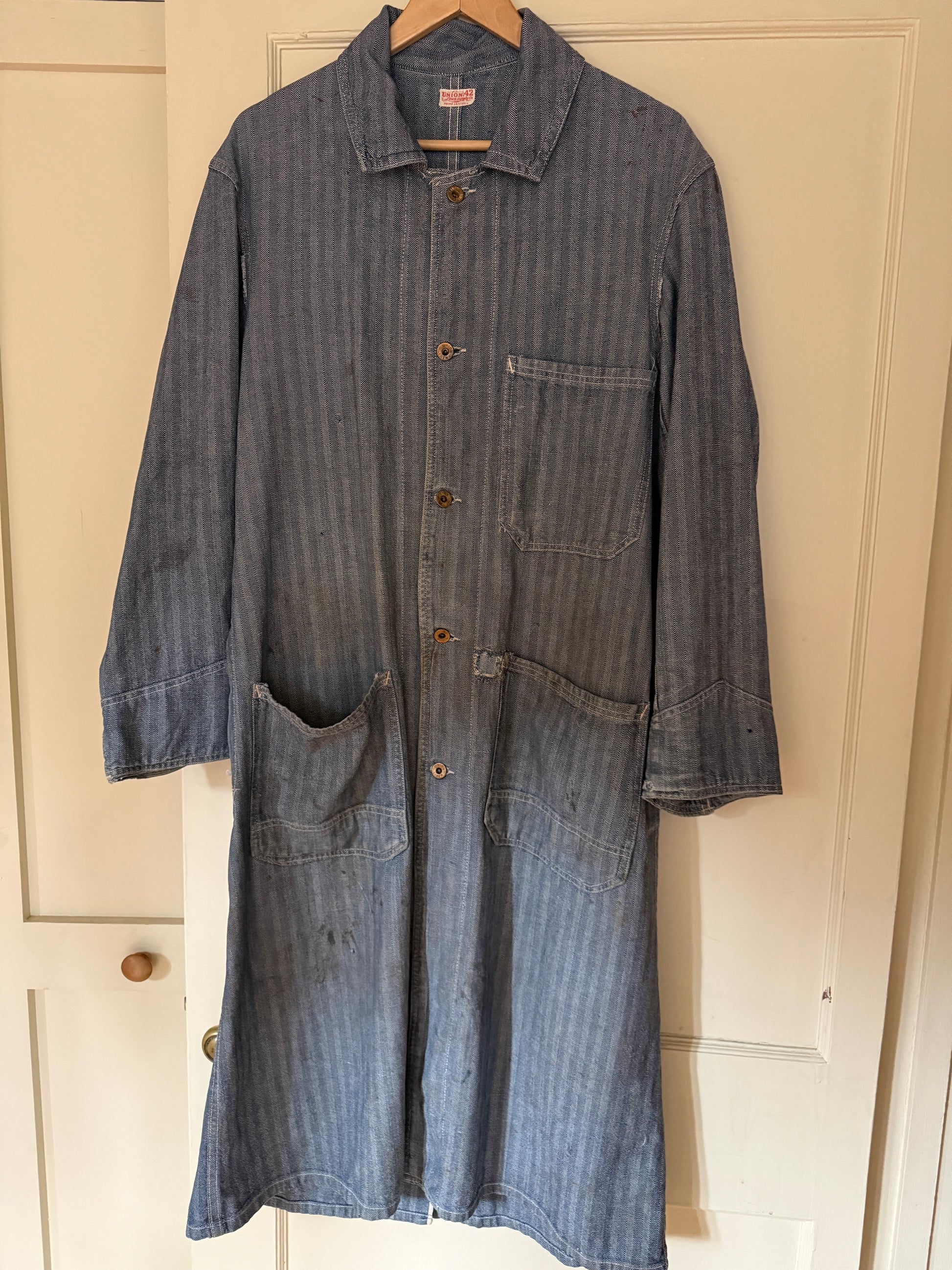 A well-worn herringbone denim work coat with a relaxed, utilitarian shape. Fading, marks, and small mends throughout speak to its history — a piece that has been lived and worked in.