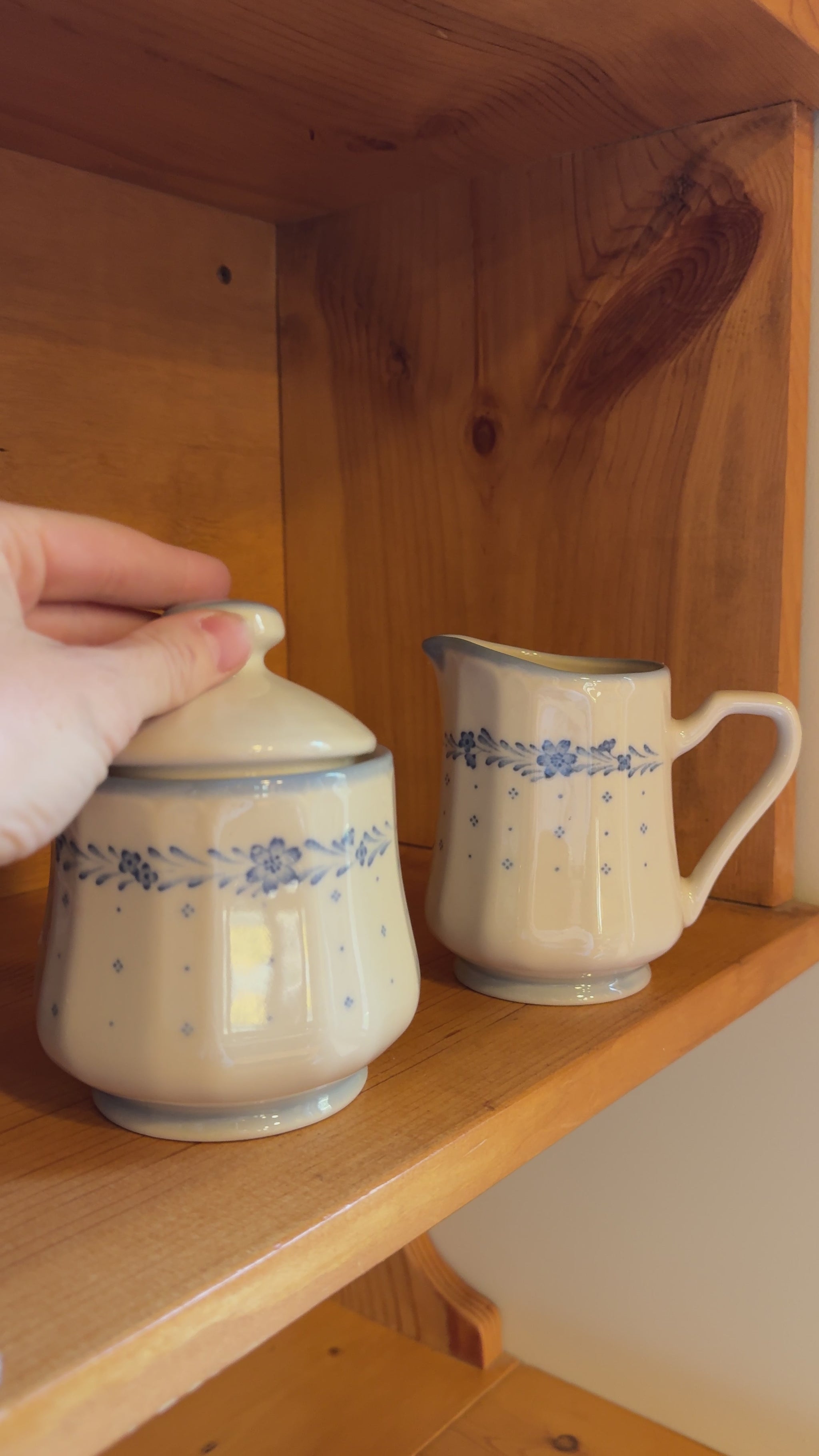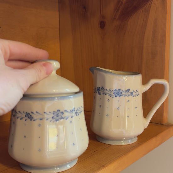 A vintage Sango Arcadia Blue cream and sugar set in stoneware. Classic blue details on a creamy base make it a lovely addition to your table or collection.