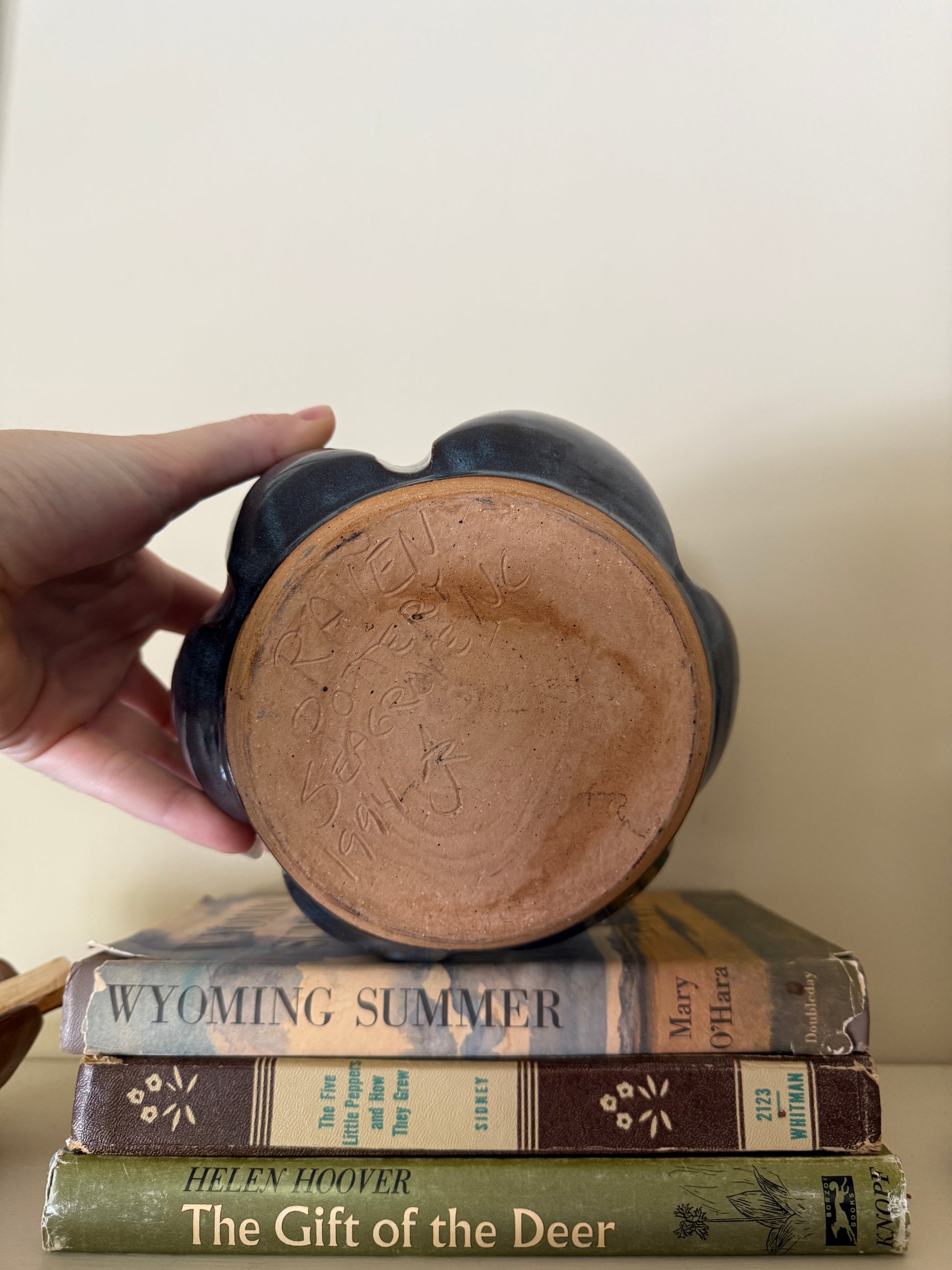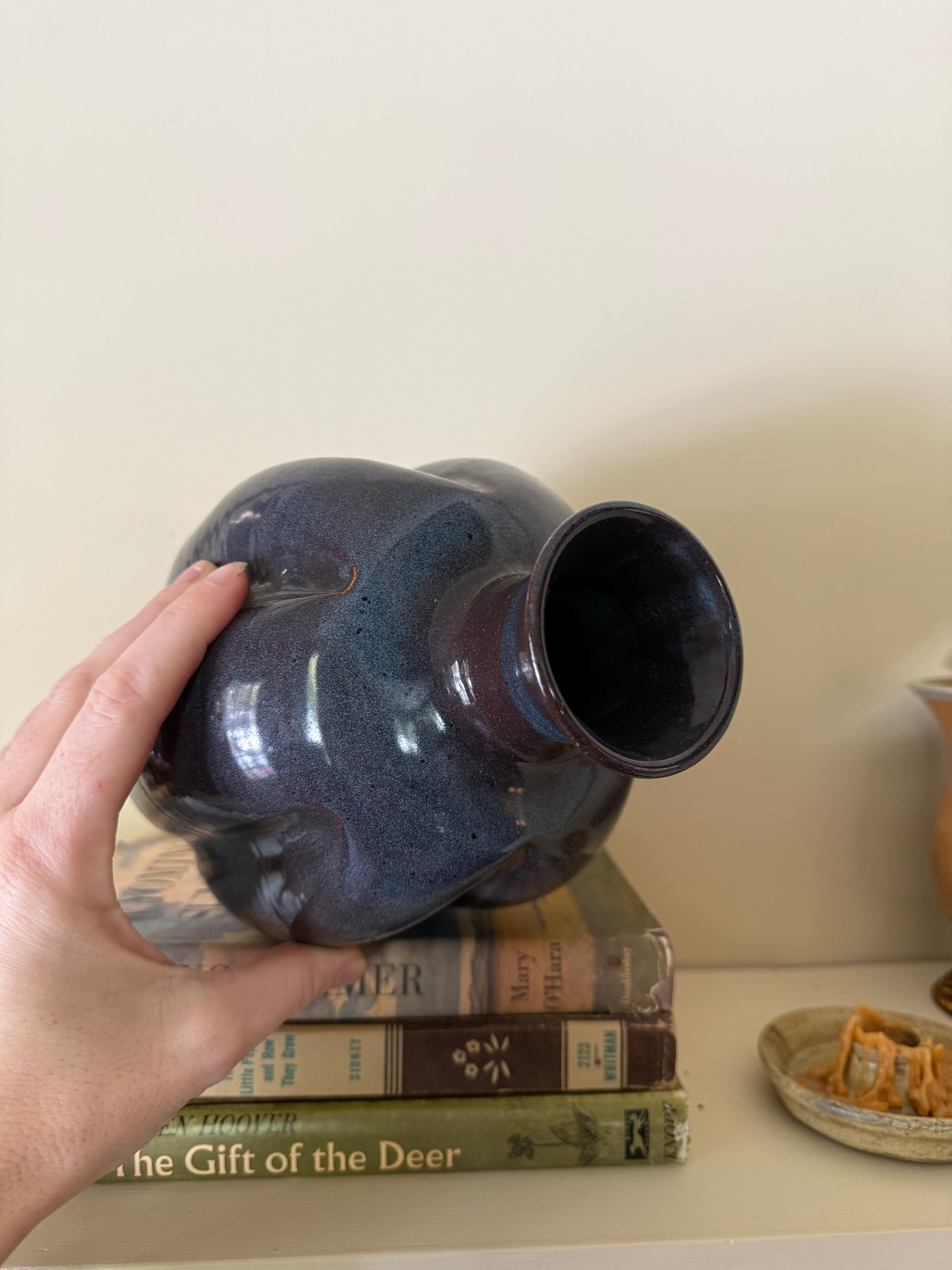 A hand-thrown studio pottery vase with a rich, dark blue glaze and softly ribbed form. Signed and dated on the base, this piece has a sculptural presence and a wide, grounded silhouette that styles beautifully on shelves, consoles, or layered with books.