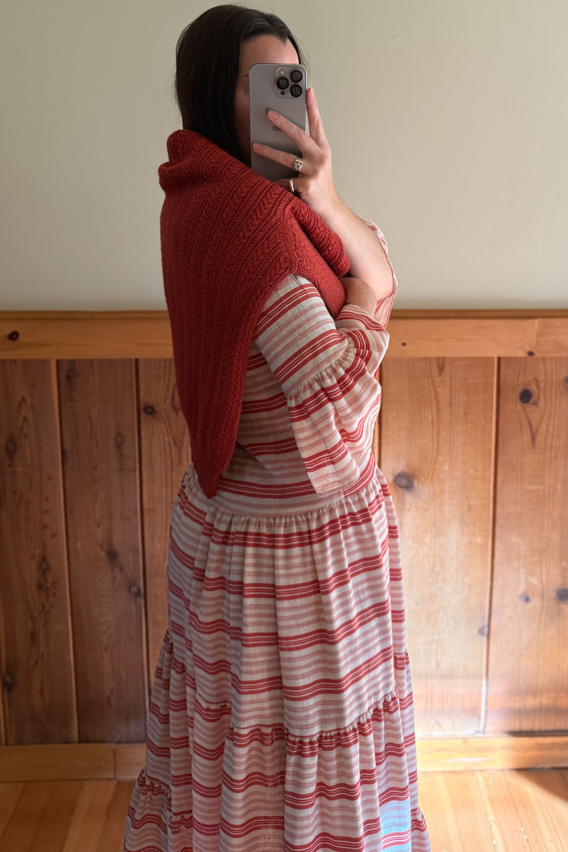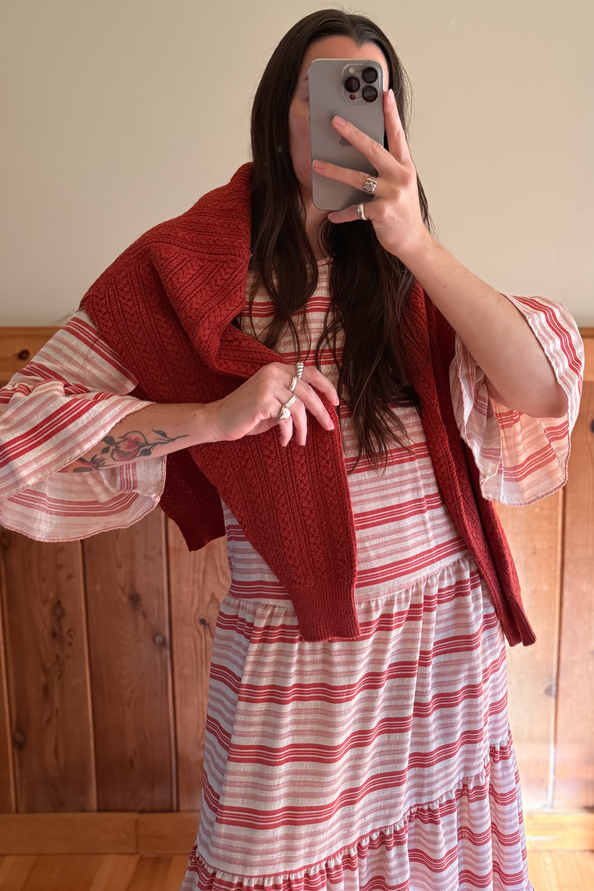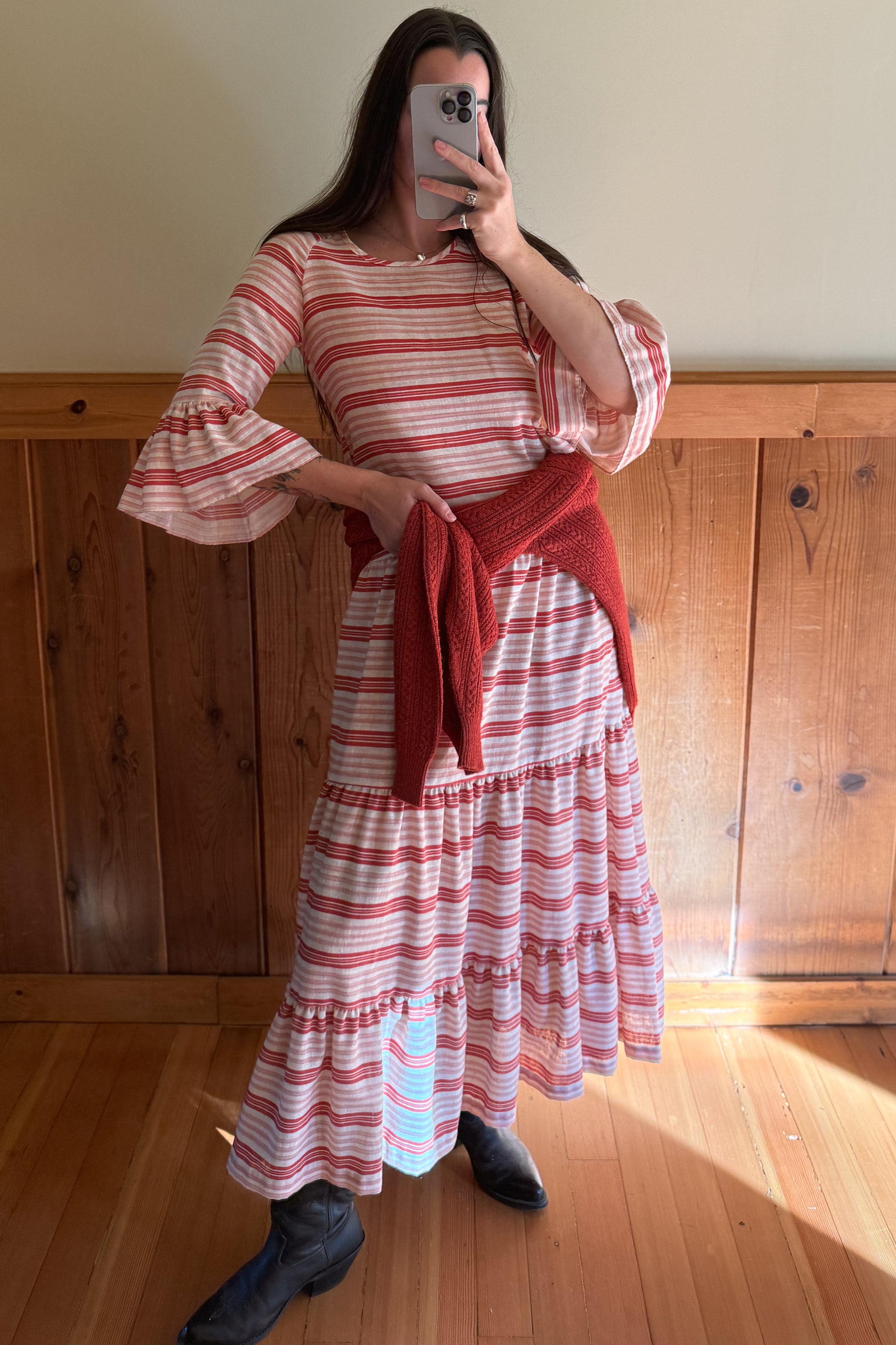 Well-crafted hand-made linen dress with rusty red striping. Features a drop waist, ruffled bell sleeves, and a back zip closure with a hook and eye at the top. No tags — thoughtfully constructed and full of character.