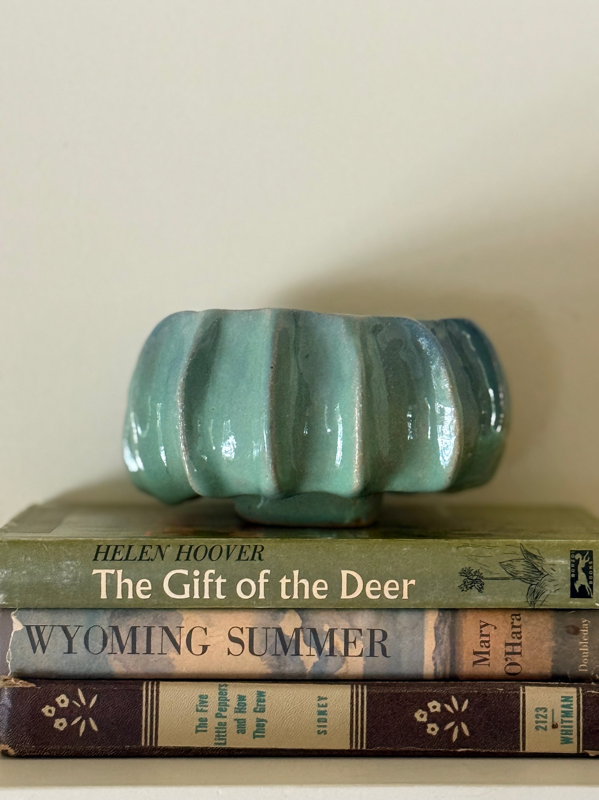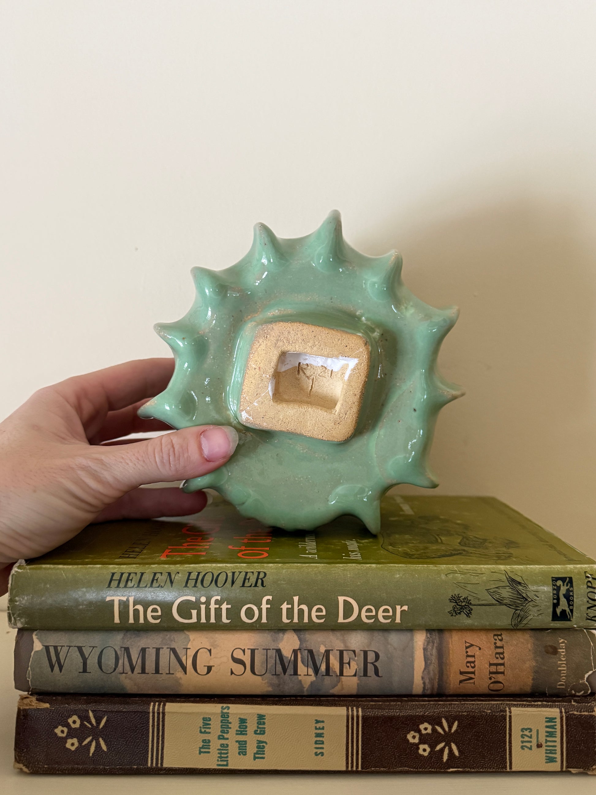 Beautiful vintage ceramic dish with a sculptural, spiked rim and glossy sea-green glaze. Feels very mid-century / studio pottery inspired and looks great styled on a shelf, coffee table, or entryway.